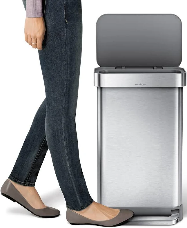 simplehuman 45L Stainless Steel Trash Can Un tacho de basura “de cocina en serio”: sólido, silencioso y diseñado para que el uso diario sea más limpio y prolijo. El pedal es de acero y ultra durable (pensado para años de uso), y la tapa cierra lento y sin ruido con el sistema de cierre amortiguado. Además, el diseño rectangular aprovecha mejor el espacio y queda moderno en cualquier cocina. Pedal de acero diseñado para durar más de 150.000 pisadas Cierre suave y silencioso (lid shox) Sistema que mantiene la bolsa ajustada y oculta (liner rim) Versión con liner pocket: guarda y dispensa repuestos de bolsas desde adentro para recambio más rápido Formato rectangular para capacidad grande sin “comerse” la cocina Ideal para cocina, departamento, familia, home office y espacios donde querés orden y estética premium.